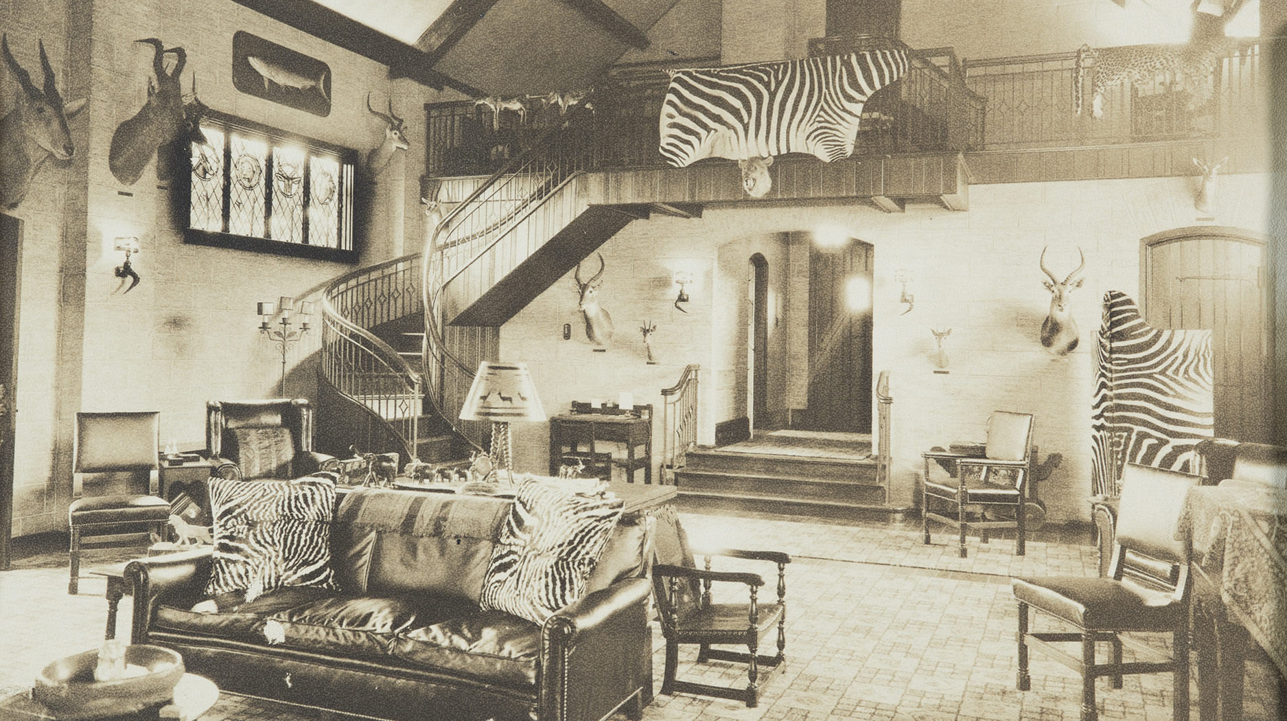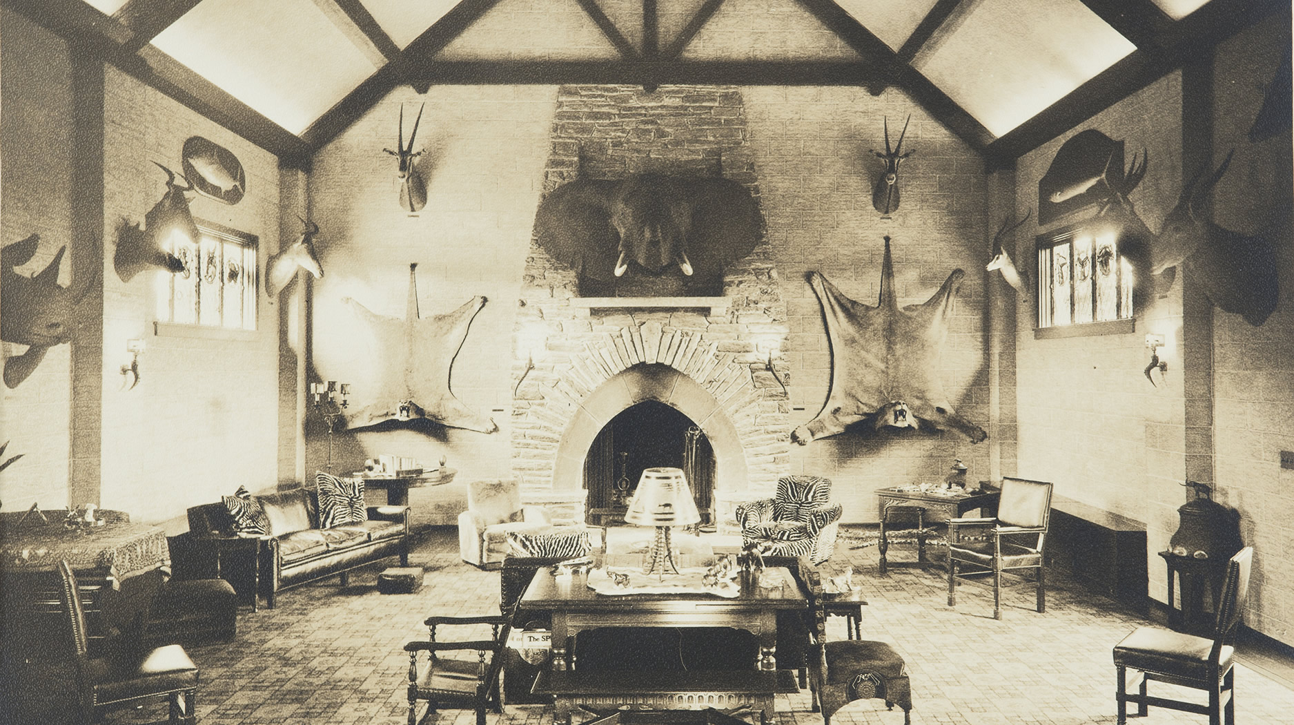 The Trophy House is a rare example of a family’s effort to preserve and document the mammals of the plains of East Africa. The house was erected in 1931, and since its opening that year, it has drawn scores of visitors and has also served as a place for Fuller family parties, receptions, and holiday events. The building reflects the Arts & Crafts architecture of the early twentieth century, with impressive attention to detail. The stained glass windows include medallions with images of African mammals, and even the lampshades and wall sconces are decorated with silhouettes of animals.